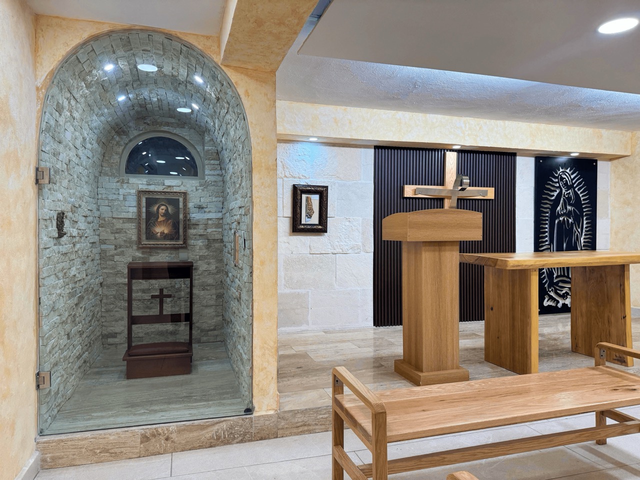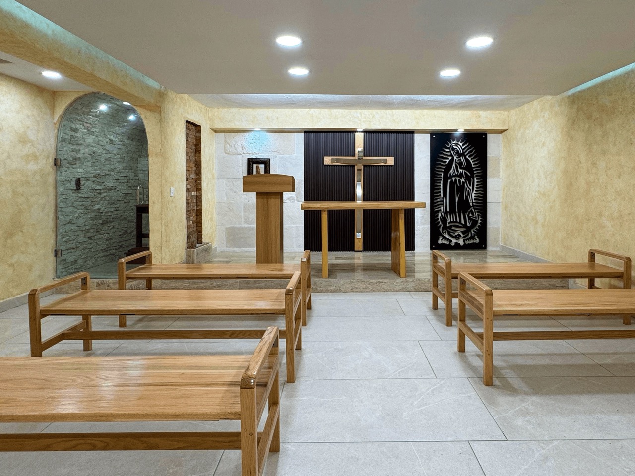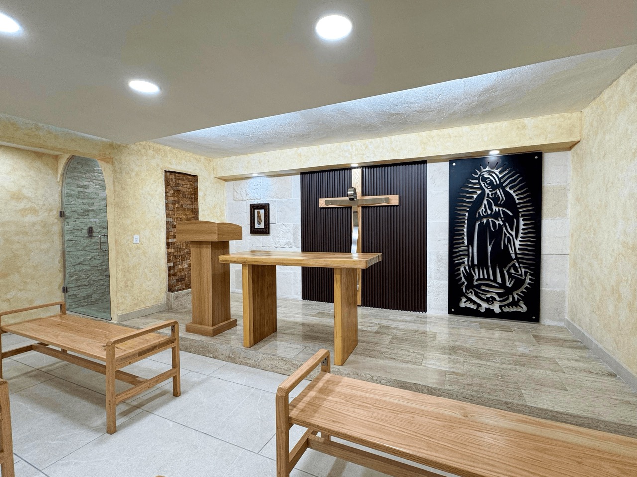 Antecedentes Siempre ha habido en todas nuestras oficinas y bodegas una imagen de la Virgen de Guadalupe. Desde el principio, fue un signo de fe sencilla, profundamente enraizada en el alma. Antes de estar en la dirección general y mientras me encargaba del área comercial, ocasionalmente me tocaba quedarme fines de semana en la Ciudad de México. Siempre el domingo asistía a la Basílica de Santa María de Guadalupe. En una de esas visitas, alrededor del año 2004, me impactó profundamente una imagen grande de la Virgen —valiosa y hermosa— que vi en la tienda oficial del recinto. Pocos años después, cuando mi padre, fundador de SANILOCK®, falleció el 28 de octubre de 2007, comencé al frente de la empresa. En los primeros días hice un viaje a la Ciudad de México, regresé a la Basílica y adquirí aquella imagen grande de la Virgen que me había impresionado. Fue un acto de gratitud, de fe y de confianza. Cuando llegó esa imagen a nuestras oficinas, todos los colaboradores nos reunimos a rezar un rosario para darle la bienvenida. Al finalizar, una colaboradora de oficinas, Ana Torres, propuso que al año siguiente hiciéramos una peregrinación a la Basílica de Guadalupe en Monterrey. Desde entonces, esa propuesta se ha convertido en tradición: cada año, el último sábado de noviembre realizamos una peregrinación con matlachines de SANILOCK como comunidad de fe. Solo en 2020, por la epidemia de COVID-19, interrumpimos ese camino. Ya llevamos 15 peregrinaciones. Los primeros años llevamos todas las imágenes de la Virgen de Guadalupe que estaban en cada oficina, cada bodega y la imagen grande de la Virgen que recibimos en 2007. Para una de esas peregrinaciones —cerca del año 2016— un colaborador de oficina sugirió llevar una imagen sólida de la Virgen, no solo los cuadros que colgaban de nuestras paredes... así lo hicimos. Días después, esa imagen quedó colocada en la entrada de la planta, acogida con gran cariño por todos. Y desde entonces, ese espacio ha ido creciendo en significado. Con el tiempo, fuimos añadiendo otros signos espirituales: una bendición papal para la comunidad SANILOCK, una reliquia y una imagen del Camino Neocatecumenal regaladas por sacerdotes, una litografía de la Virgen de Guadalupe pintada con la boca por Andrea Pérez, …Todo fue sembrando algo más que devoción. Muchos de nosotros nos persignamos al pasar por ese lugar. A un costado de ese espacio estaba el taller mecánico. Un día, decidimos moverlo a otro lugar dentro de la planta. Y así, el espacio quedó libre para hacer realidad un anhelo que llevaba años gestándose en el corazón: construir una capilla en la entrada de la planta. Esta capilla no es solo un lugar físico: es la expresión concreta de una espiritualidad vivida con humildad, constancia y alegría a lo largo de los años.