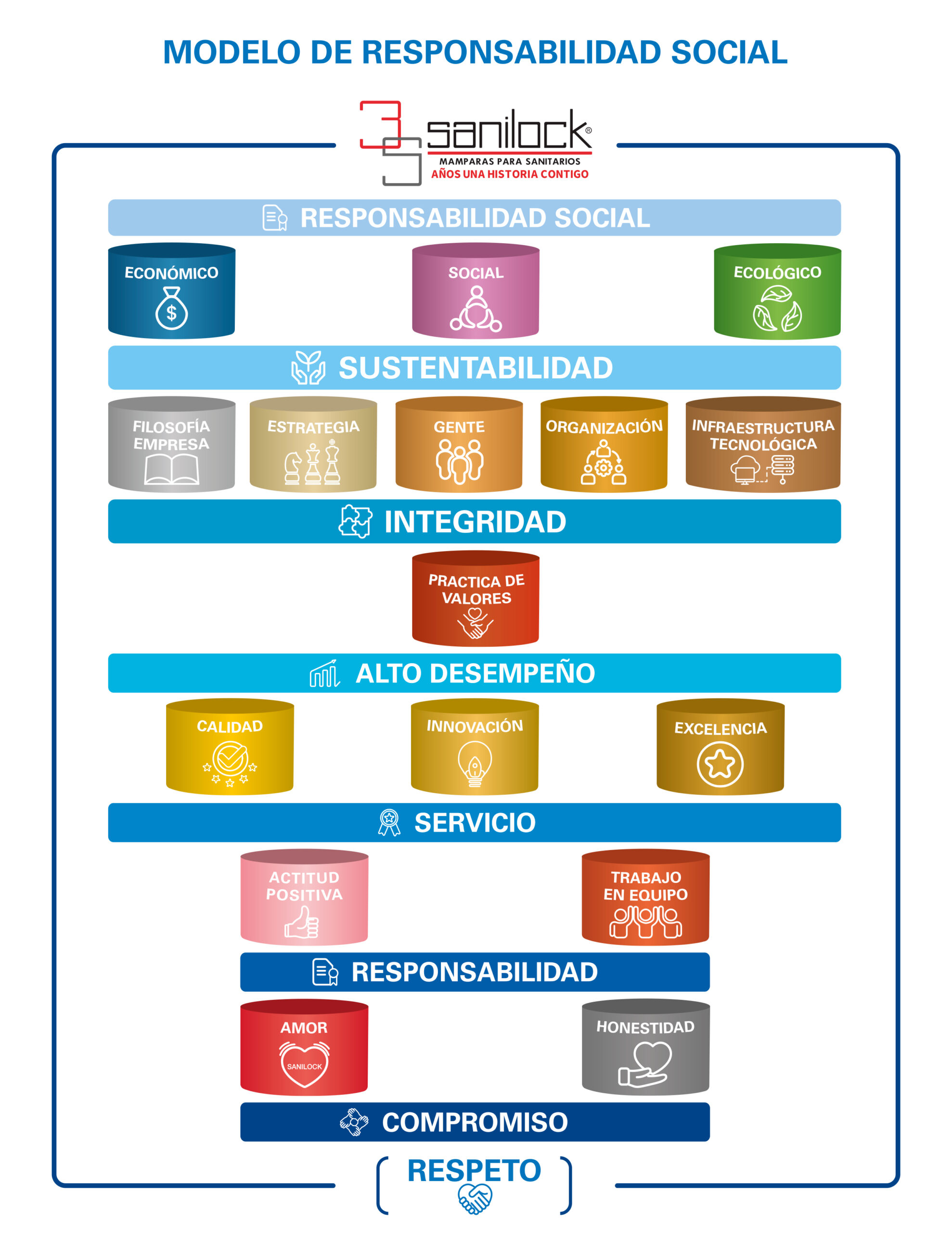 En SANILOCK® la responsabilidad social forma parte integral de nuestro modelo de negocios. Reconocemos la importancia de crear valor a los diferentes grupos de interés compatible con el compromiso social y el respeto al medio ambiente, de tal forma que se satisfagan contribuyendo así al desarrollo sostenible. El modelo de negocio de SANILOCK® tiene como eje central a la persona, quien es el motor que impulsa a la empresa a cumplir sus objetivos y mantener su competitividad. Todas las acciones de responsabilidad social en SANILOCK® parten desde y hacia la persona. Con este sentido en SANILOCK® marcamos nuestro sello y lo reflejamos en nuestro modelo de negocio. Nuestras acciones de responsabilidad social se encausan en cada uno de los siguientes componentes: