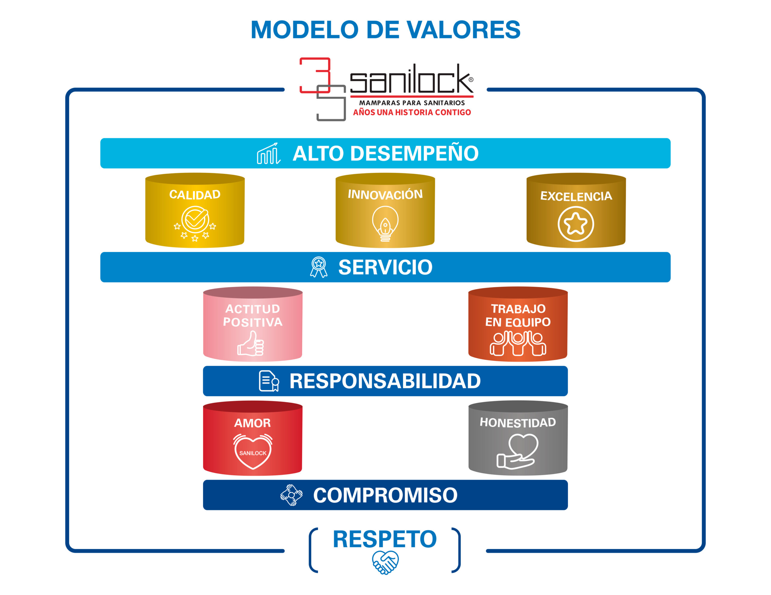 Respeto, Compromiso, Amor, Honestidad, Responsabilidad, Actitud Positiva, Trabajo en Equipo, Servicio, Calidad, Innovación, Excelencia y Alto Desempeño.