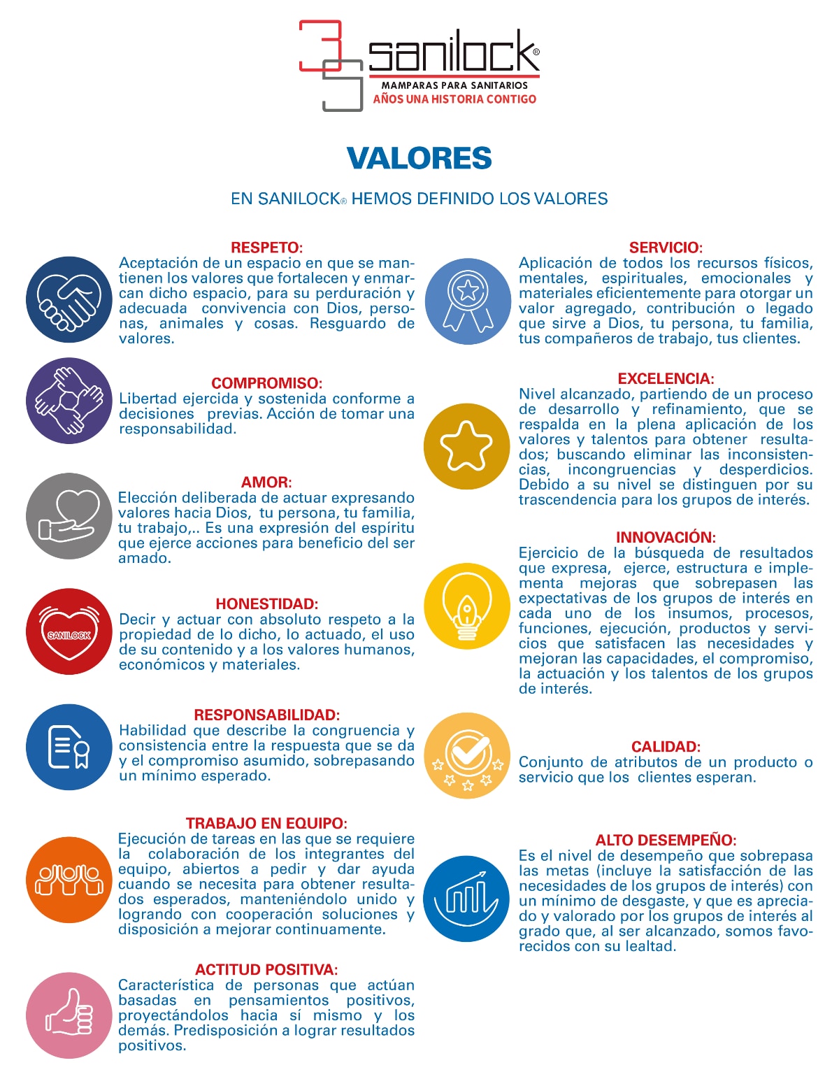 SANILOCK® cuenta con la mejor calidad en el producto, servicio y de vida, satisfaciendo las necesidades de los clientes, las personas y la sociedad generando beneficios que sobrepasan las expectativas que se esperan de la empresa. Lograda con una comunidad organizada con vanguardia en el servicio, en mejora continua, con valores de actitud positiva, responsabilidad, amor, honestidad, compromiso, respeto y servicio al cliente, con capacitación y aplicación de nuestras tecnologías, confiables, unida, con comunicación y trabajo en equipo enfocado y eficiente, que tiene satisfacciones por el trabajo bien hecho y por los retos logrados. Que desarrolla la calidad de los productos y servicios permanentemente soportada con una actualizada ingeniería de los productos y una operación rentable en constante crecimiento, mejora e innovación
