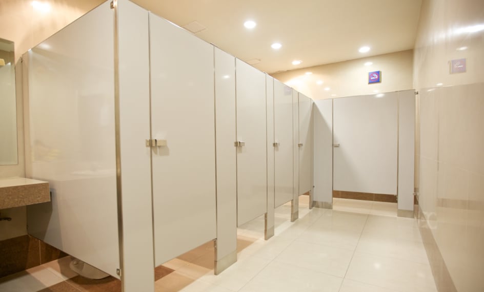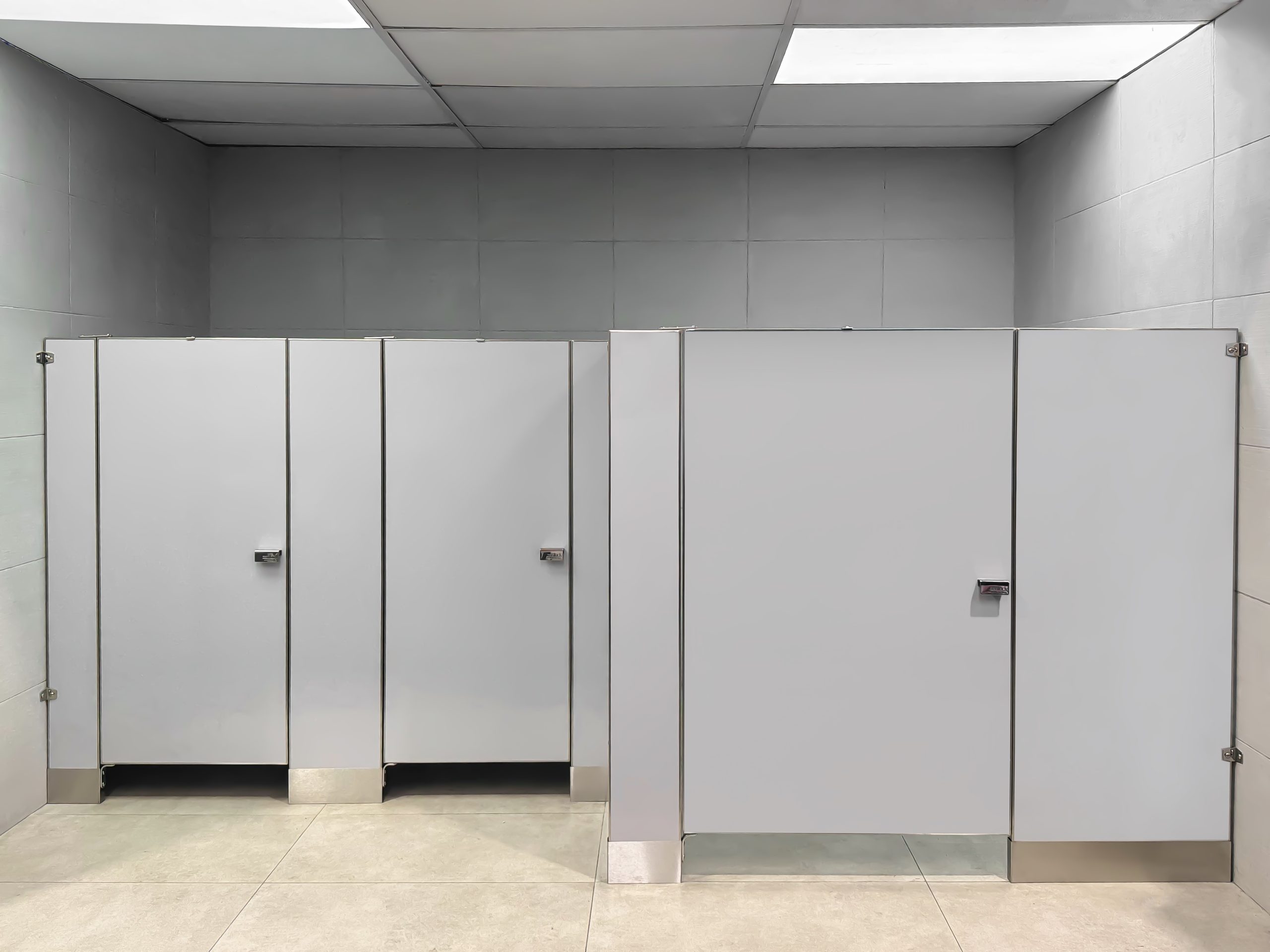 No hace contacto ni con el suelo ni con el techo de su área de baños públicos, solo con las paredes. El sistema de fijación es solo a los muros.