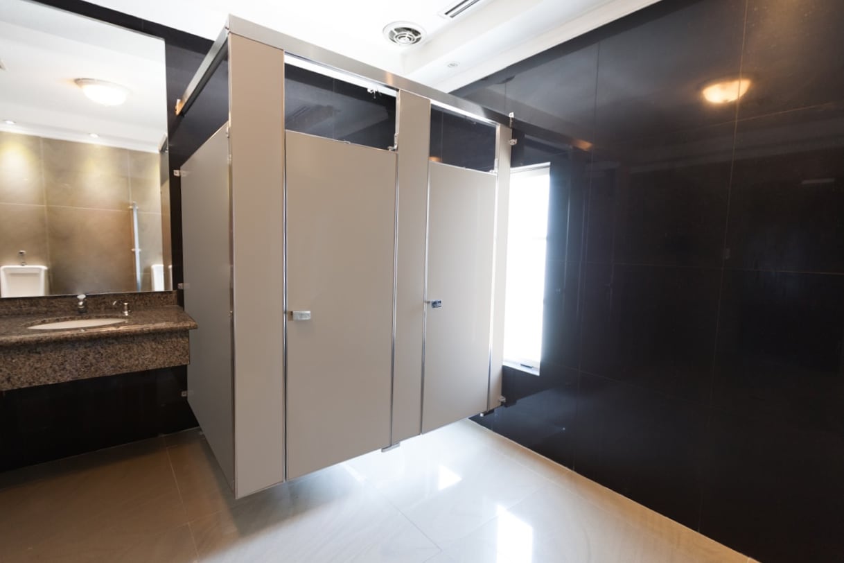No hace contacto ni con el suelo ni con el techo de su área de baños públicos, solo con las paredes. El sistema de fijación es solo a los muros.