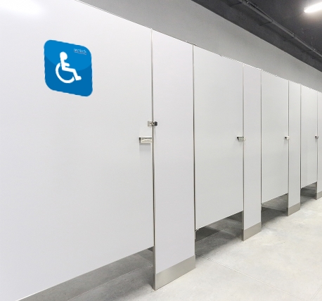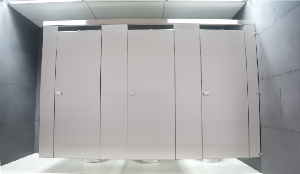 No hace contacto ni con el suelo ni con el techo de su área de baños públicos, solo con las paredes. El sistema de fijación es solo a los muros.